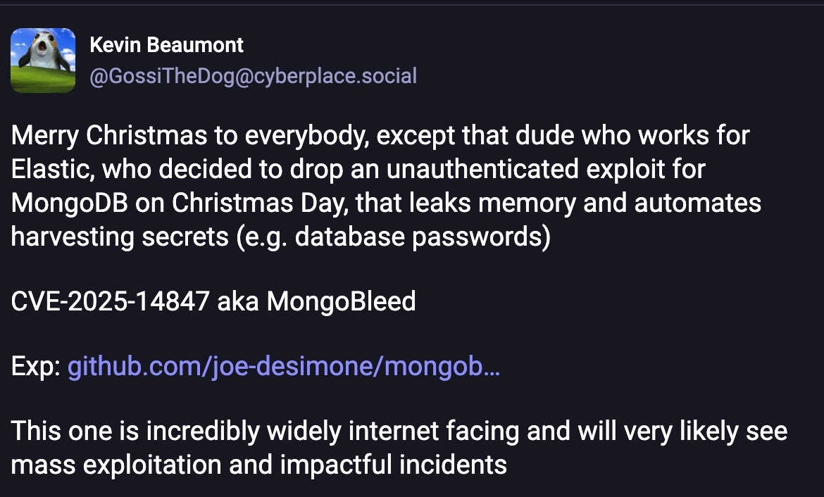 MongoBleed, officially CVE-2025-14847, is a recently-uncovered extremely sensitive vulnerability affecting basically all versions of MongoDB since ~2017.