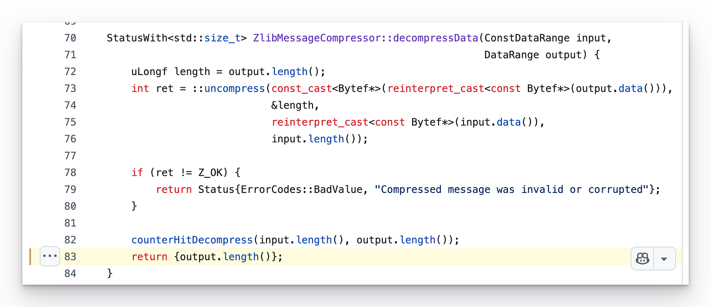 Here is the line (pre-fix): https://github.com/mongodb/mongo/blame/b2f3ca9c996ba409e7d48601fca16c28fd58b774/src/mongo/transport/message_compressor_zlib.cpp#L83